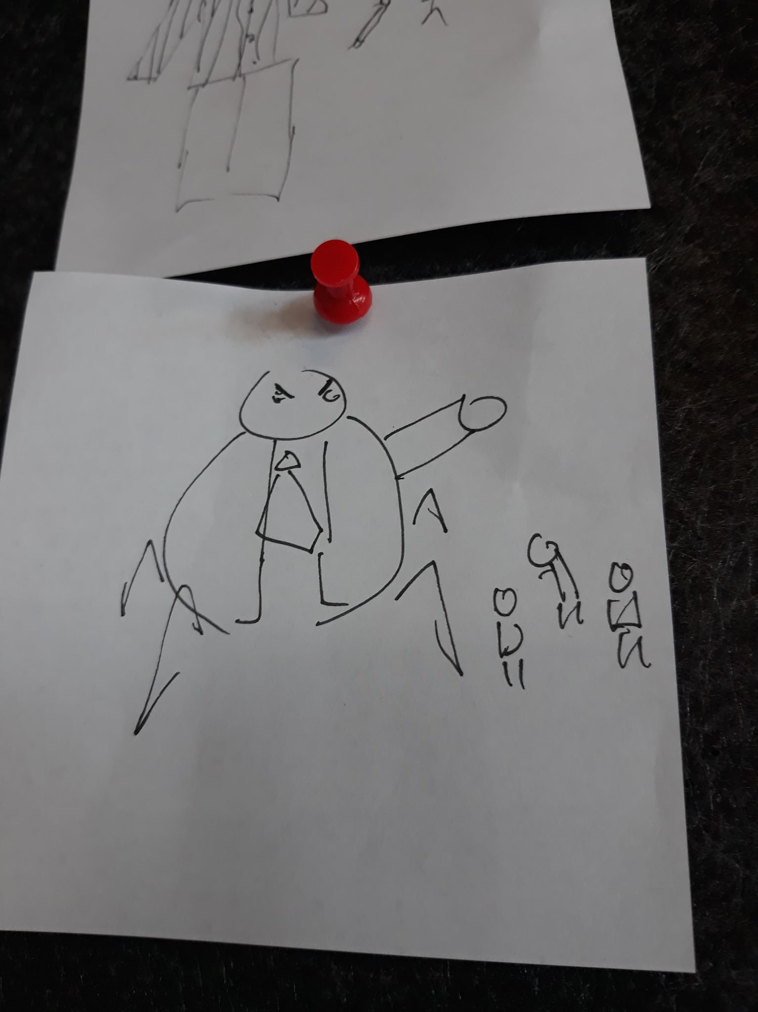 I chose an image that somebody had drawn for the word ‘Boss’ – a scribbly drawing of a large angry man wearing a tie. He seems to almost have spiderlike legs, making him into a monstrous caricature of a stereotypical nasty boss in an office. Several tiny people are scurrying around at his feet.