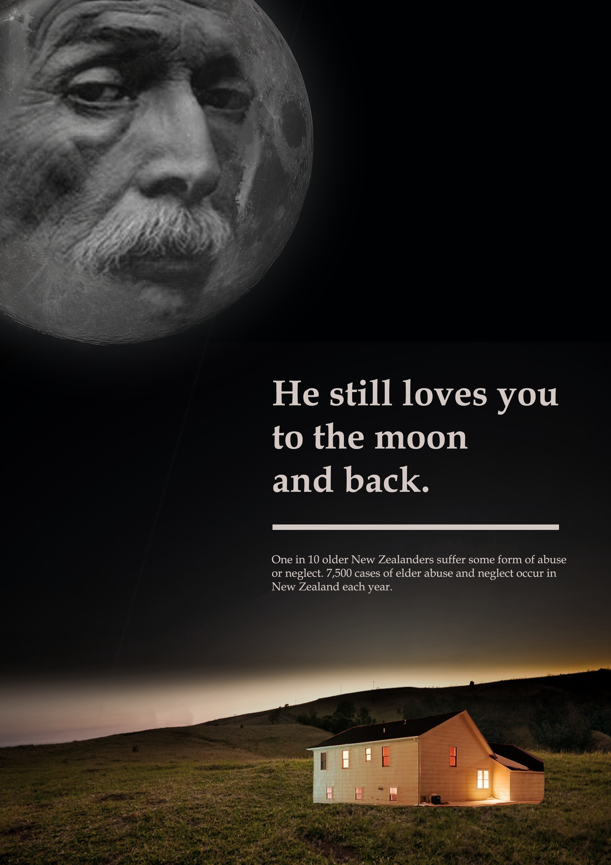 This is today’s poster I made using statistics found in a news article online. Although this poster is visually appealing, I don’t think the meaning is immediately obvious – I was thinking it would be interpreted as the elderly person isolated on the moon, separated from warmth and family in the house down below. However this isn’t obvious, I need to work on making my imagery clearer.